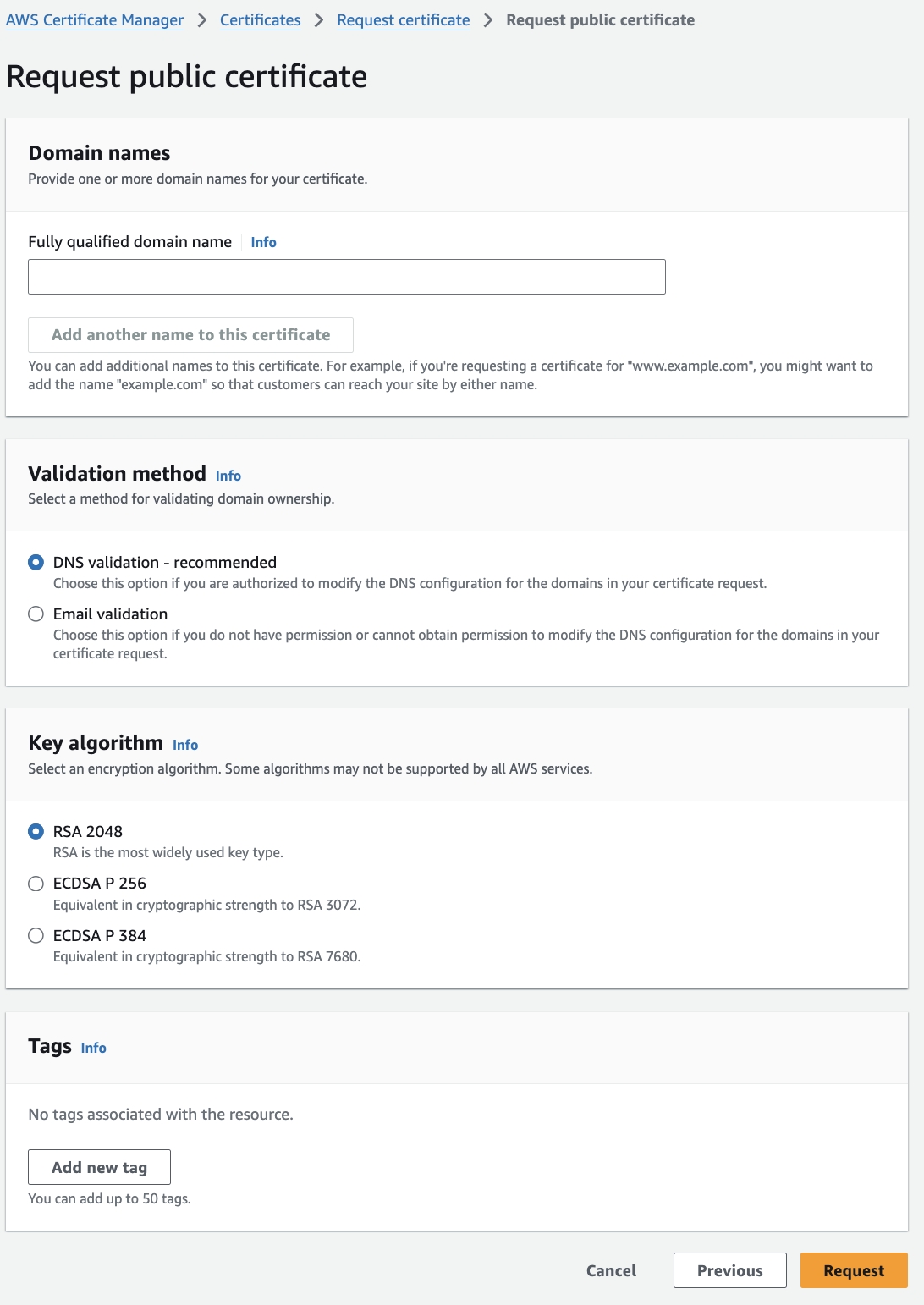 We recommend using AWS Certificate to create your SSL certificate for FinOps Center due to integration with CloudFront. Like any of your other web application, the Fully qualified domain name for your FinOps Center needs to be knows prior to requesting certifcate.